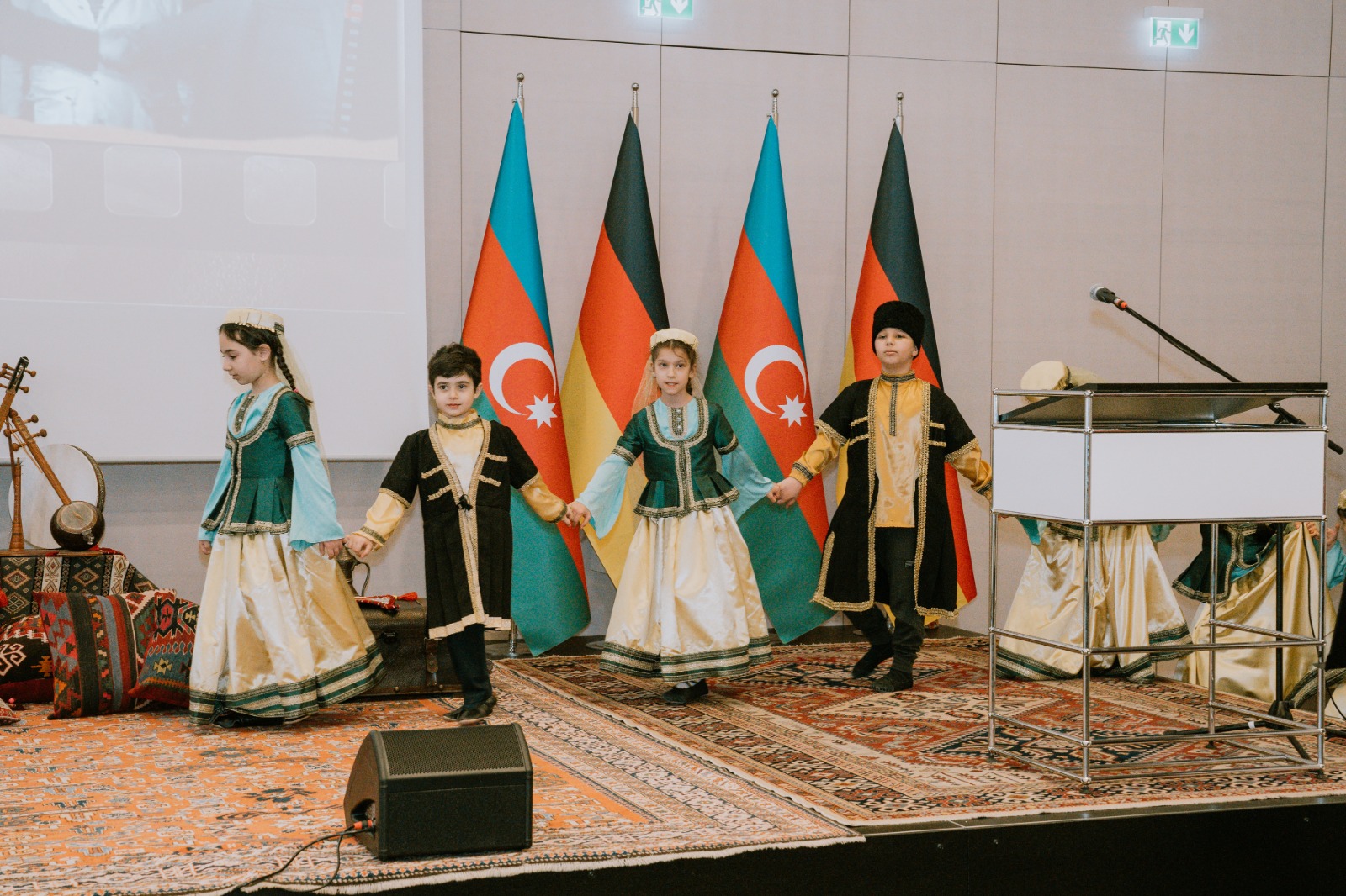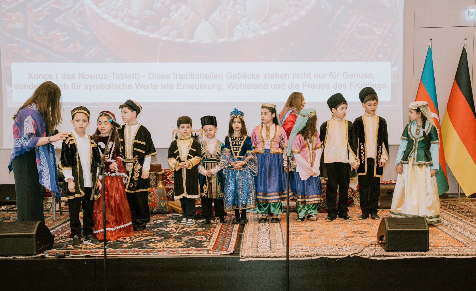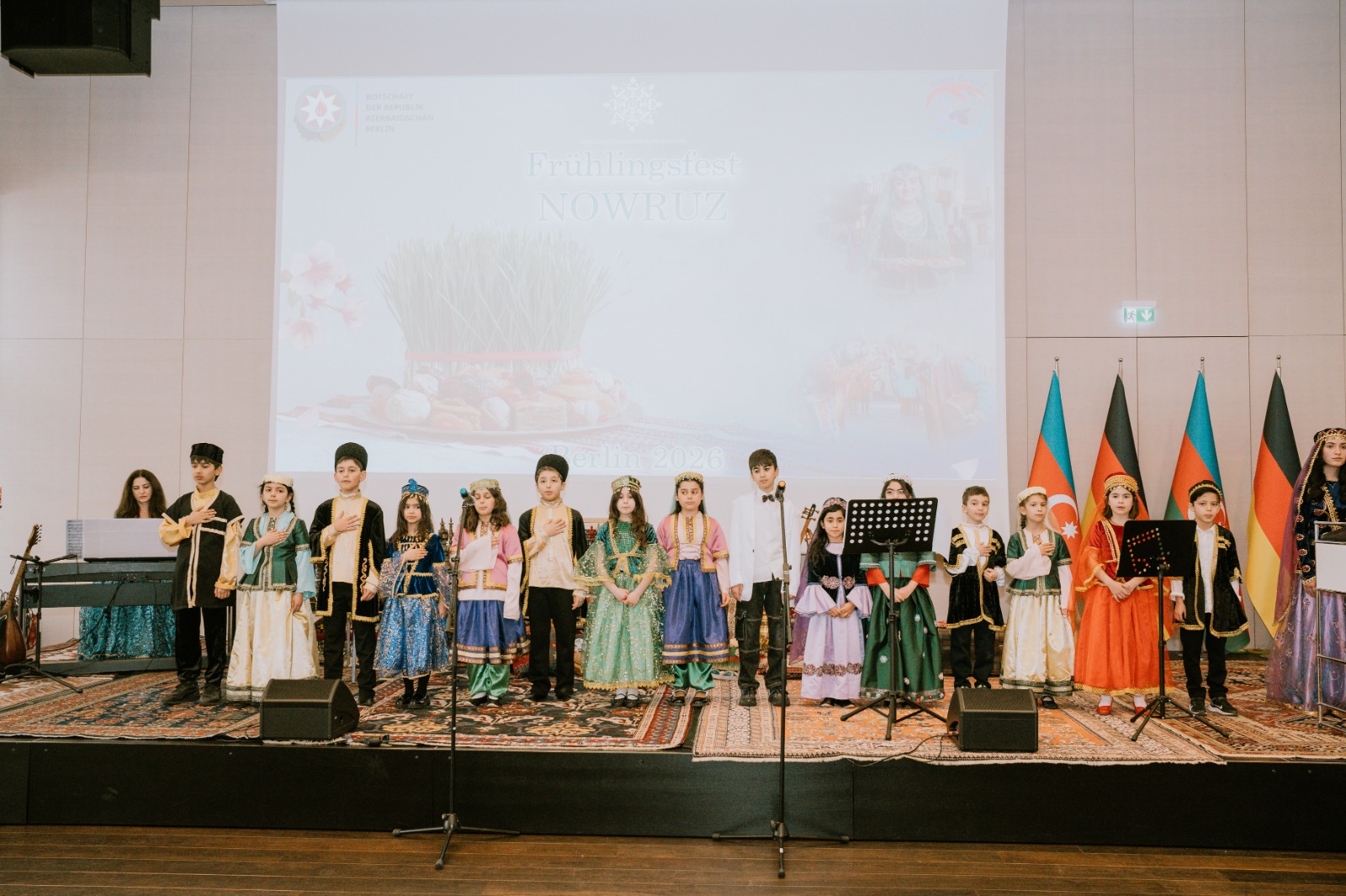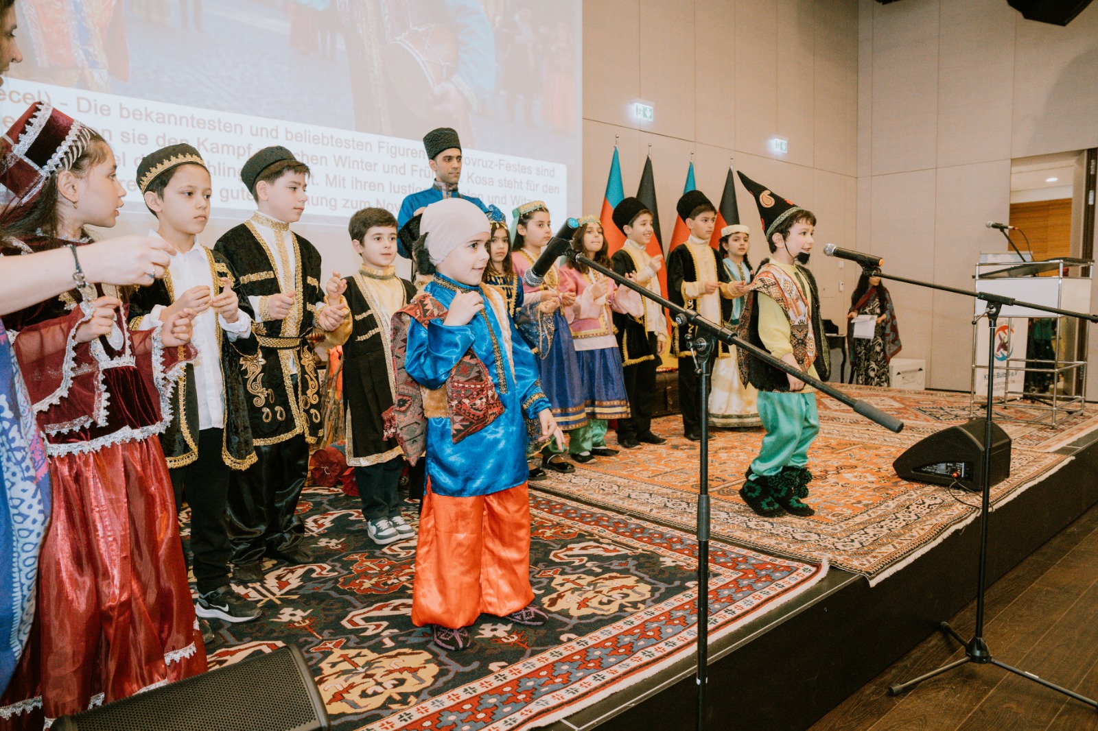 Die Veranstaltung begann mit der Aufführung der aserbaidschanischen Nationalhymne durch aserbaidschanische Kinder, die an den Muttersprachkursen des Kulturhauses Khari Bülbül teilnehmen.